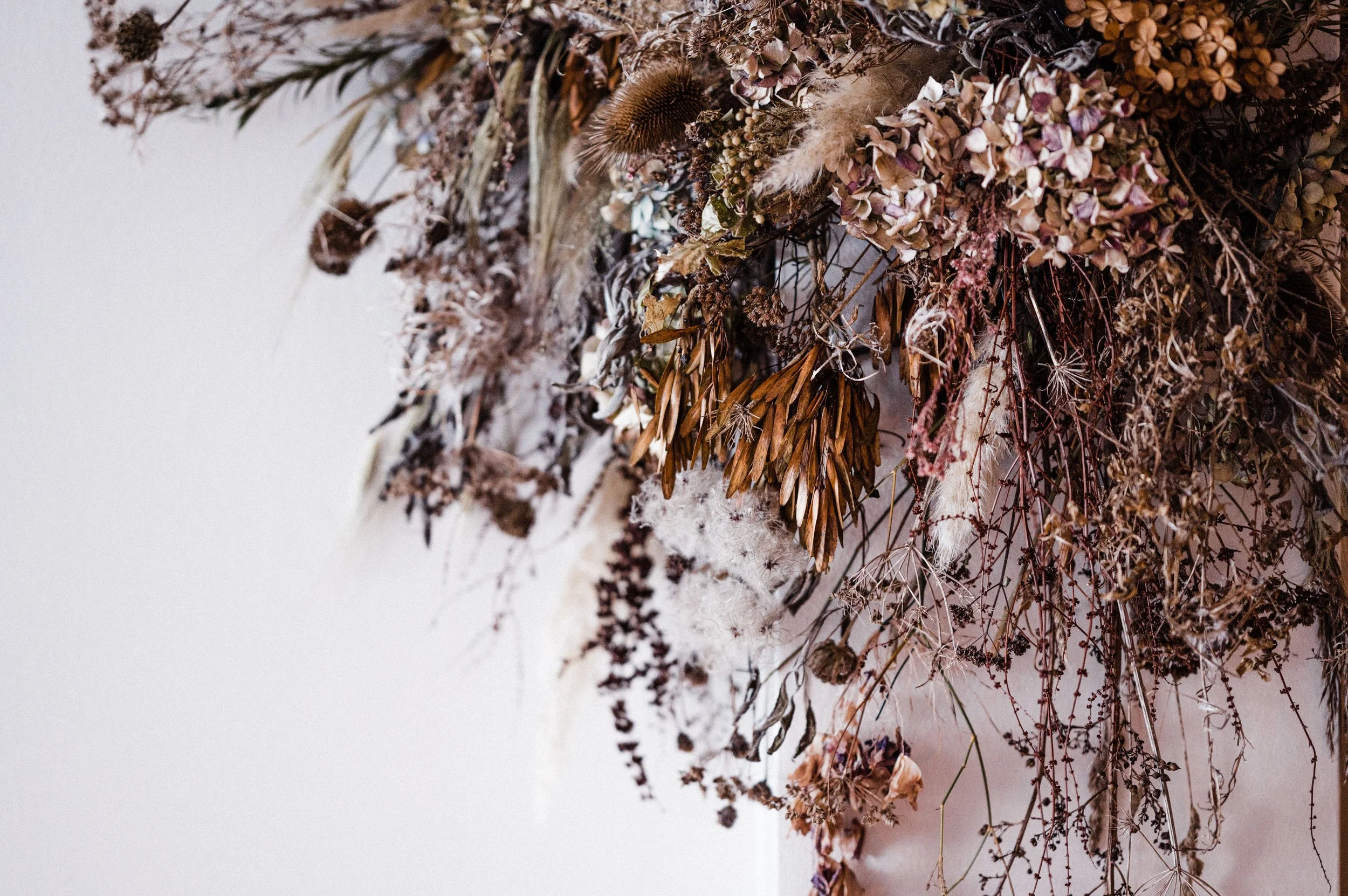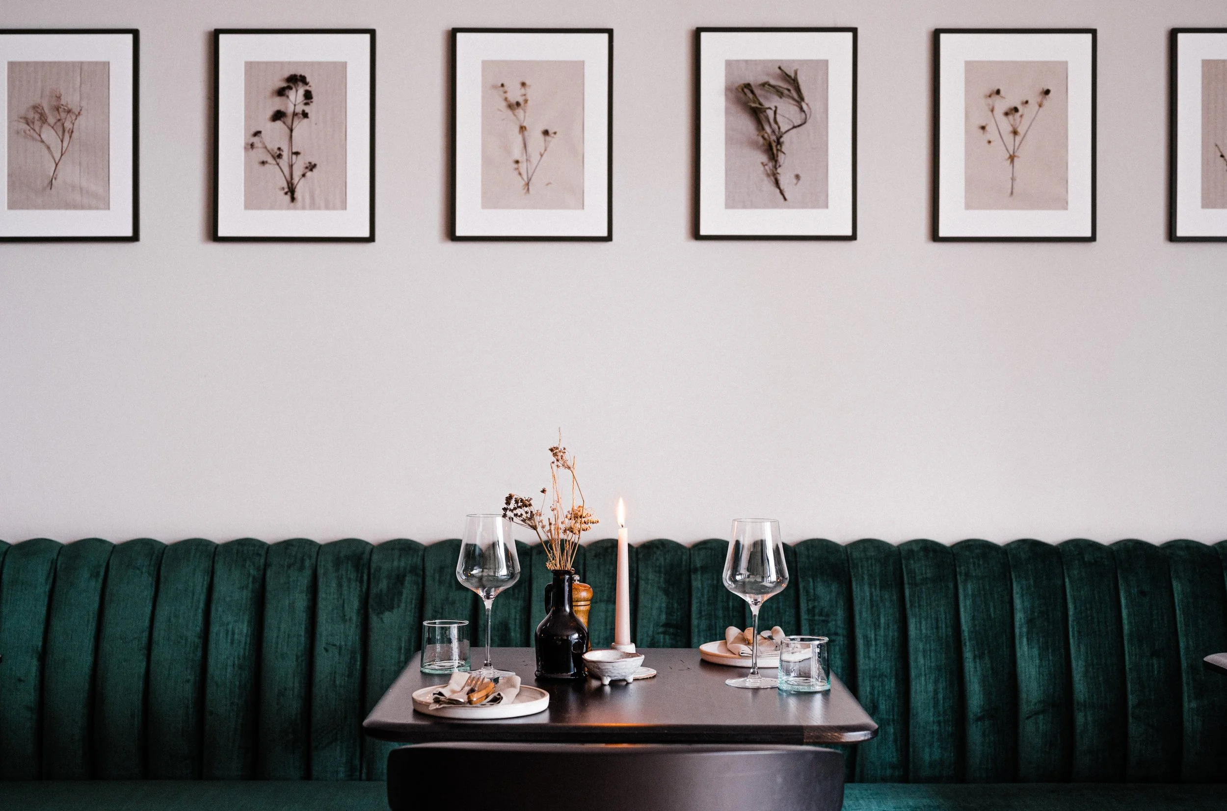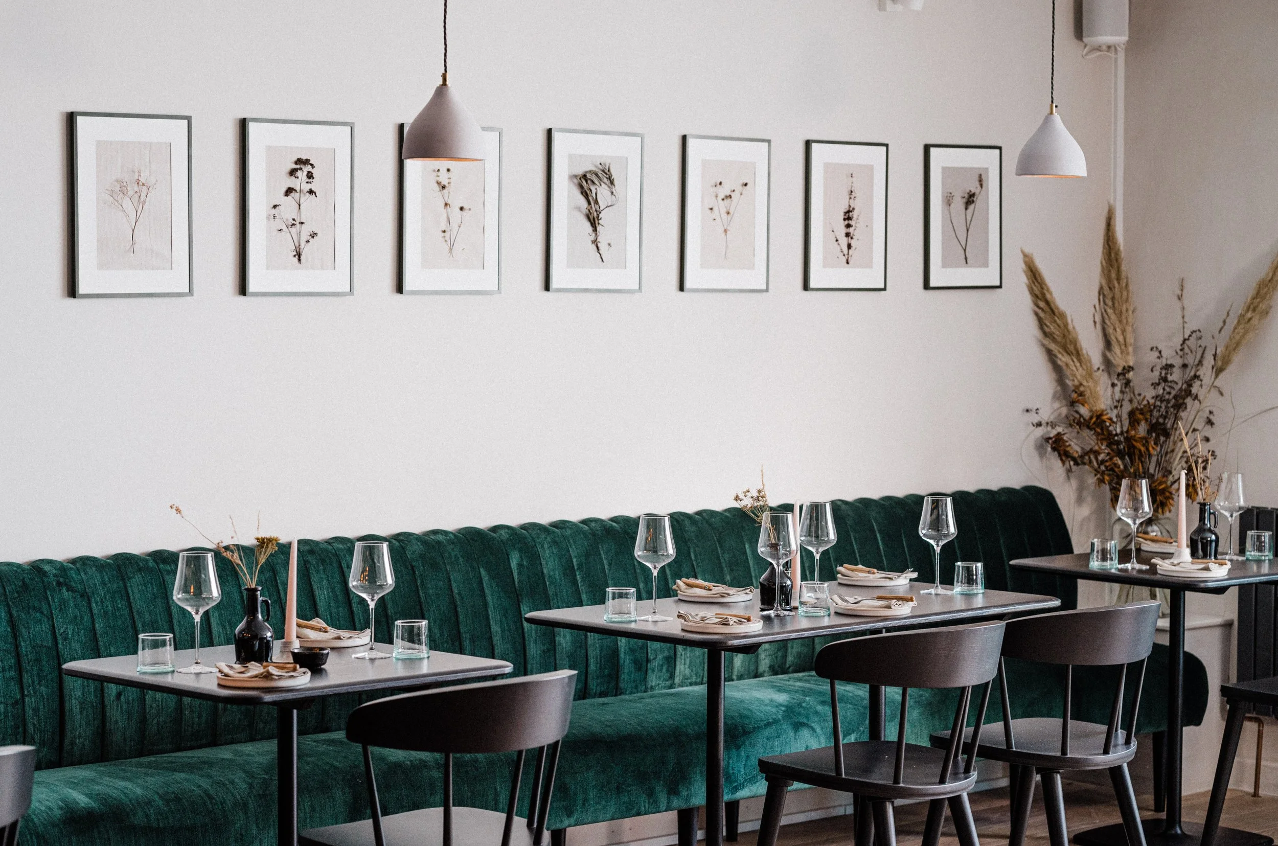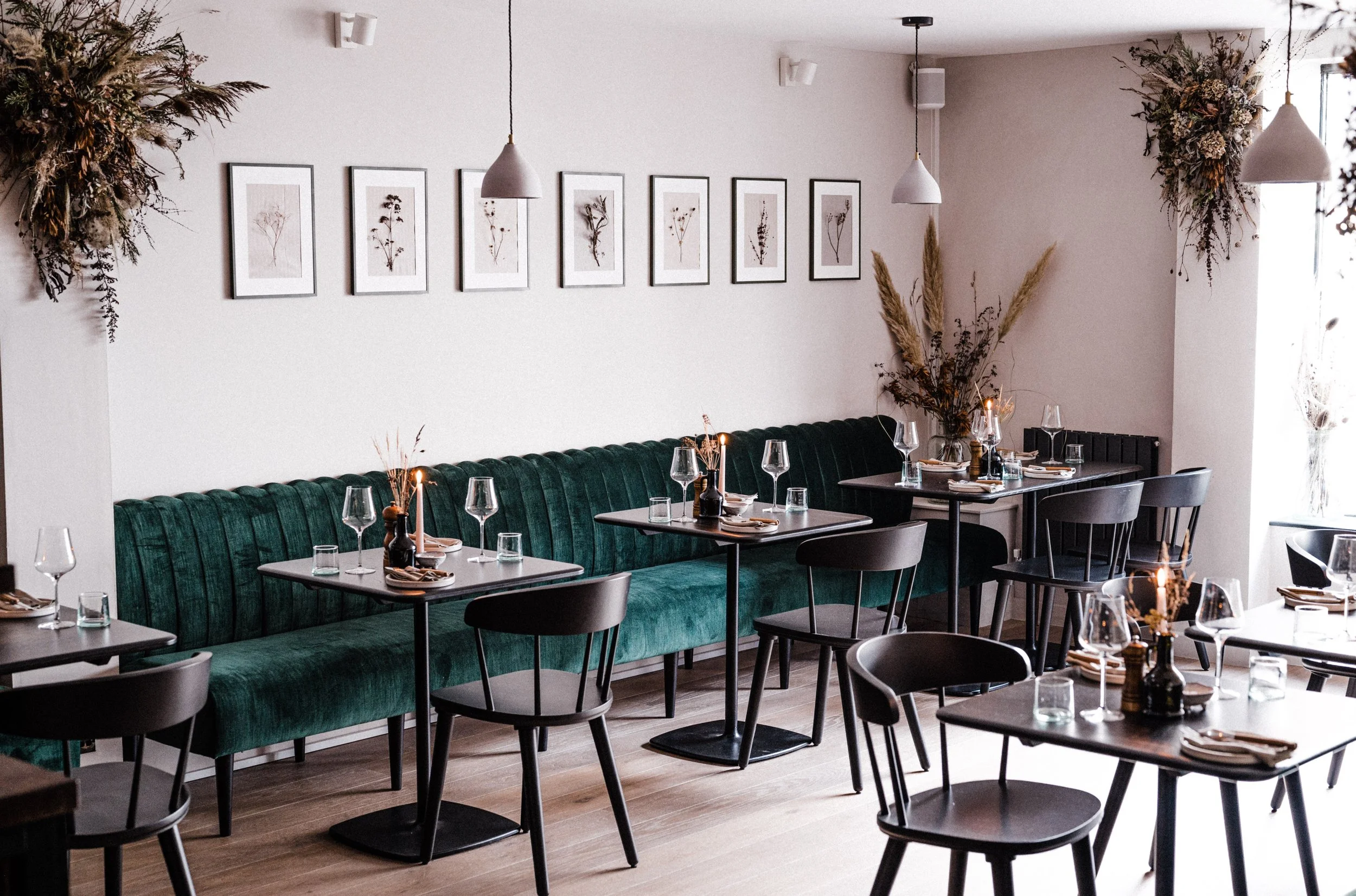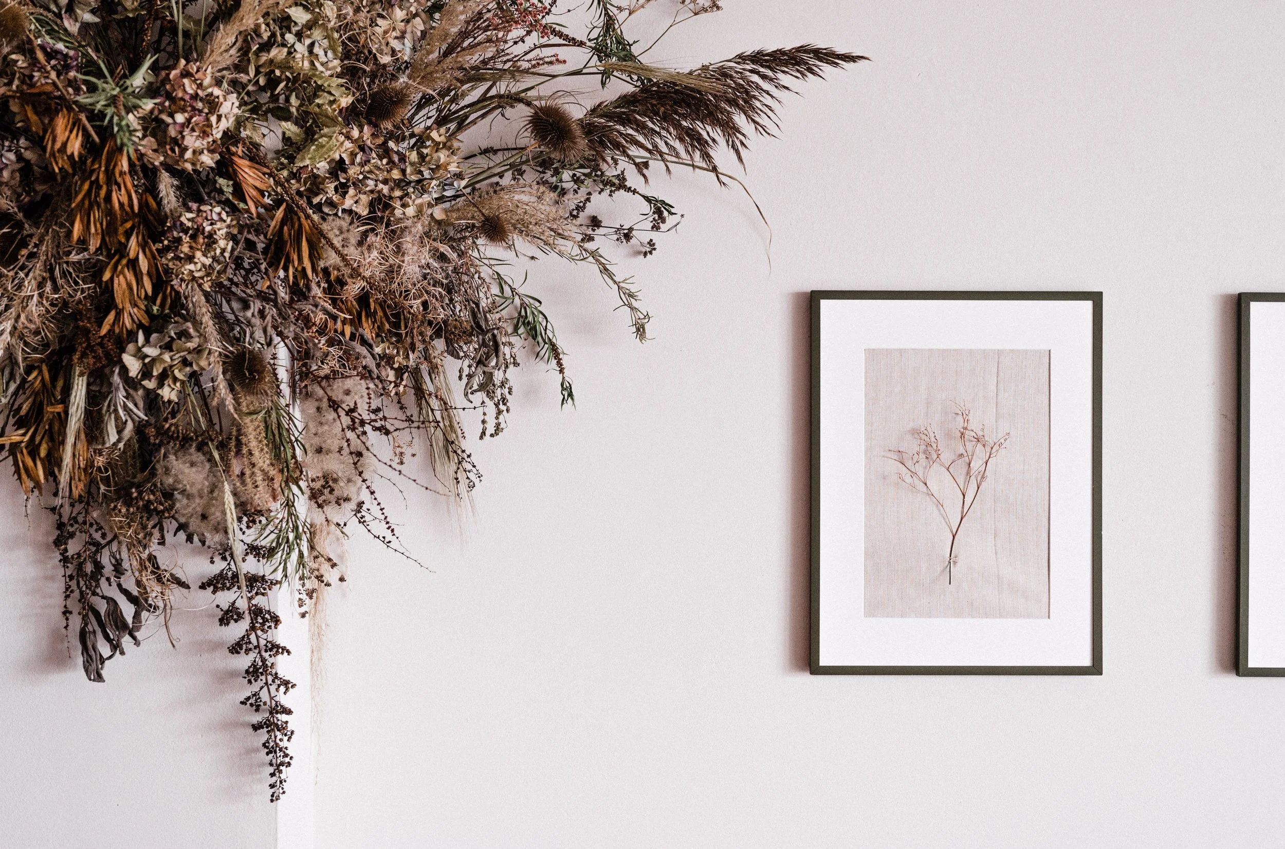Harriet brought me onto this project to create the opening look for her new restaurant. Part of my brief was to forage local foliage to dry and create floral installations with, which would work with their chosen ceramics and create a feeling of being surrounded by nature. To create continuity I then stitched individual species into framed artwork.